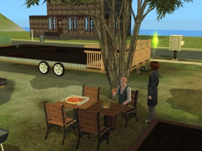 自シムにも指示は出さずに完全に傍観体制で見ていたんですが、大家がピザを外にあるテーブルセットに広げても特になんのアナウンスもナシ。他にはなにも届かないみたいで大家一人がピザをパクつき、他の住人達は全く無関心。ピザを取ろうともしないし大家の周りに集まるでもナシ・・・。