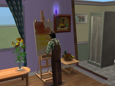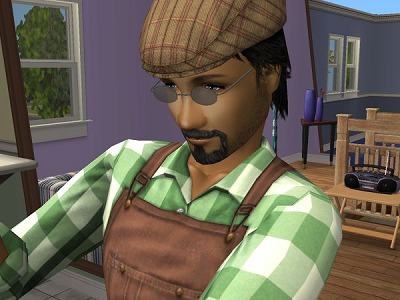 ↑ 今回は髪型も服装もデフォルトを使用。画家といったらベレー帽?という単純な発想から髪型が決まり、貧乏画家なんだからちょっと汚れた服よね?って思いつつ、フリータイムかなんかで追加されたペンキで汚れた服とか彼のためにあるような気がしたのでこれに決まりv